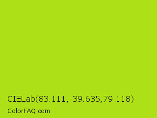 CIELab 83.111,-39.635,79.118 Color is a normal lime color and the nearest color is Inch Worm #b0e313. Hex code #aee017 and RGB value is rgb(174,224,23). In RGB color space, this color is composed of 68% red, 88% green, 9% blue, In CMYK color space, this color is composed of 22% cyan, 0% magenta, 90% yellow , 12% black , In HSL color space, this color has a hue angle of 75° , 81% saturation and 48% lightness.