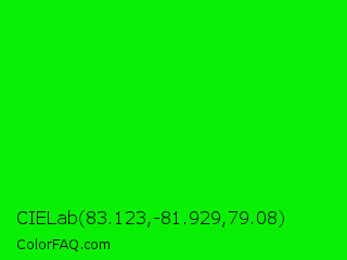 CIELab 83.123,-81.929,79.08 Color is a normal green color and the nearest color is Green #00ff00. Hex code #0af005 and RGB value is rgb(10,240,5). In RGB color space, this color is composed of 4% red, 94% green, 2% blue, In CMYK color space, this color is composed of 96% cyan, 0% magenta, 98% yellow , 6% black , In HSL color space, this color has a hue angle of 119° , 96% saturation and 48% lightness.