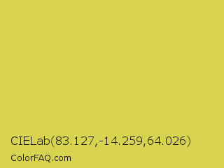 CIELab 83.127,-14.259,64.026 Color is a normal yellow color and the nearest color is Wattle #dcd747. Hex code #d9d44f and RGB value is rgb(217,212,79). In RGB color space, this color is composed of 85% red, 83% green, 31% blue, In CMYK color space, this color is composed of 0% cyan, 2% magenta, 64% yellow , 15% black , In HSL color space, this color has a hue angle of 58° , 64% saturation and 58% lightness.