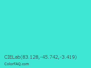 CIELab 83.128,-45.742,-3.419 Color is a normal cyan color and the nearest color is Turquoise #40e0d0. Hex code #3fe6d4 and RGB value is rgb(63,230,212). In RGB color space, this color is composed of 25% red, 90% green, 83% blue, In CMYK color space, this color is composed of 73% cyan, 0% magenta, 8% yellow , 10% black , In HSL color space, this color has a hue angle of 174° , 77% saturation and 57% lightness.