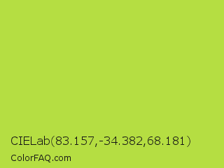 CIELab 83.157,-34.382,68.181 Color is a normal lime color and the nearest color is Conifer #acdd4d. Hex code #b5de42 and RGB value is rgb(181,222,66). In RGB color space, this color is composed of 71% red, 87% green, 26% blue, In CMYK color space, this color is composed of 18% cyan, 0% magenta, 70% yellow , 13% black , In HSL color space, this color has a hue angle of 76° , 70% saturation and 56% lightness.
