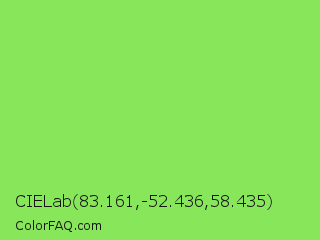 CIELab 83.161,-52.436,58.435 Color is a light green color and the nearest color is Kiwi #8ee53f. Hex code #87e659 and RGB value is rgb(135,230,89). In RGB color space, this color is composed of 53% red, 90% green, 35% blue, In CMYK color space, this color is composed of 41% cyan, 0% magenta, 61% yellow , 10% black , In HSL color space, this color has a hue angle of 100° , 74% saturation and 63% lightness.