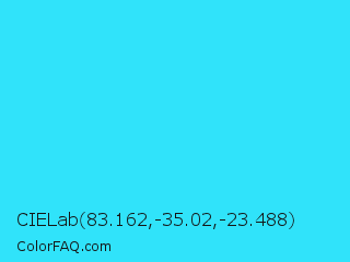 CIELab 83.162,-35.02,-23.488 Color is a normal cyan color and the nearest color is Loeen #15f2fd. Hex code #30e3fa and RGB value is rgb(48,227,250). In RGB color space, this color is composed of 19% red, 89% green, 98% blue, In CMYK color space, this color is composed of 81% cyan, 9% magenta, 0% yellow , 2% black , In HSL color space, this color has a hue angle of 187° , 95% saturation and 58% lightness.