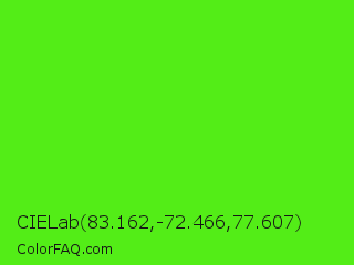 CIELab 83.162,-72.466,77.607 Color is a normal green color and the nearest color is Chlorophyll Green #4aff00. Hex code #53ed17 and RGB value is rgb(83,237,23). In RGB color space, this color is composed of 33% red, 93% green, 9% blue, In CMYK color space, this color is composed of 65% cyan, 0% magenta, 90% yellow , 7% black , In HSL color space, this color has a hue angle of 103° , 86% saturation and 51% lightness.