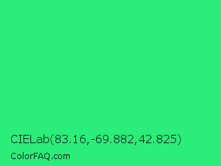 CIELab 83.16,-69.882,42.825 Color is a normal green color and the nearest color is UFO Green #3cd070. Hex code #2aed7a and RGB value is rgb(42,237,122). In RGB color space, this color is composed of 16% red, 93% green, 48% blue, In CMYK color space, this color is composed of 82% cyan, 0% magenta, 49% yellow , 7% black , In HSL color space, this color has a hue angle of 145° , 84% saturation and 55% lightness.