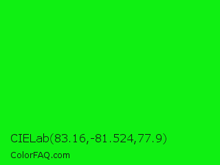 CIELab 83.16,-81.524,77.9 Color is a normal green color and the nearest color is Green #00ff00. Hex code #0ff012 and RGB value is rgb(15,240,18). In RGB color space, this color is composed of 6% red, 94% green, 7% blue, In CMYK color space, this color is composed of 94% cyan, 0% magenta, 93% yellow , 6% black , In HSL color space, this color has a hue angle of 121° , 88% saturation and 50% lightness.