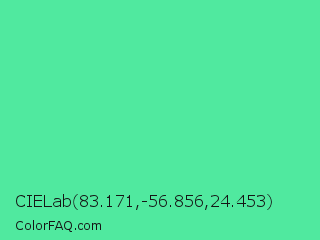 CIELab 83.171,-56.856,24.453 Color is a light green color and the nearest color is Eucalyptus #44d7a8. Hex code #50e99f and RGB value is rgb(80,233,159). In RGB color space, this color is composed of 31% red, 91% green, 62% blue, In CMYK color space, this color is composed of 66% cyan, 0% magenta, 32% yellow , 9% black , In HSL color space, this color has a hue angle of 151° , 78% saturation and 61% lightness.