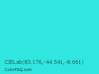 CIELab 83.176,-44.541,-8.661 Color is a normal cyan color and the nearest color is Turquoise #40e0d0. Hex code #30e6de and RGB value is rgb(48,230,222). In RGB color space, this color is composed of 19% red, 90% green, 87% blue, In CMYK color space, this color is composed of 79% cyan, 0% magenta, 3% yellow , 10% black , In HSL color space, this color has a hue angle of 177° , 78% saturation and 55% lightness.