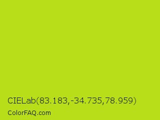 CIELab 83.183,-34.735,78.959 Color is a normal lime color and the nearest color is Inch Worm #b0e313. Hex code #b8de1a and RGB value is rgb(184,222,26). In RGB color space, this color is composed of 72% red, 87% green, 10% blue, In CMYK color space, this color is composed of 17% cyan, 0% magenta, 88% yellow , 13% black , In HSL color space, this color has a hue angle of 72° , 79% saturation and 49% lightness.
