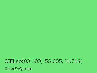 CIELab 83.183,-56.005,41.719 Color is a light green color and the nearest color is Very Light Malachite Green #64e986. Hex code #6ee87d and RGB value is rgb(110,232,125). In RGB color space, this color is composed of 43% red, 91% green, 49% blue, In CMYK color space, this color is composed of 53% cyan, 0% magenta, 46% yellow , 9% black , In HSL color space, this color has a hue angle of 127° , 73% saturation and 67% lightness.