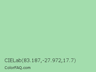 CIELab 83.187,-27.972,17.7 Color is a light green color and the nearest color is Celadon #ace1af. Hex code #a3ddad and RGB value is rgb(163,221,173). In RGB color space, this color is composed of 64% red, 87% green, 68% blue, In CMYK color space, this color is composed of 26% cyan, 0% magenta, 22% yellow , 13% black , In HSL color space, this color has a hue angle of 130° , 46% saturation and 75% lightness.