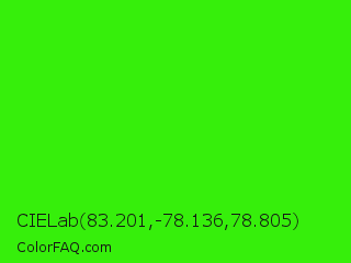 CIELab 83.201,-78.136,78.805 Color is a normal green color and the nearest color is Neon Green #39ff14. Hex code #36ef0b and RGB value is rgb(54,239,11). In RGB color space, this color is composed of 21% red, 94% green, 4% blue, In CMYK color space, this color is composed of 77% cyan, 0% magenta, 95% yellow , 6% black , In HSL color space, this color has a hue angle of 109° , 91% saturation and 49% lightness.