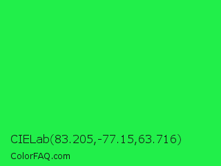 CIELab 83.205,-77.15,63.716 Color is a normal green color and the nearest color is Malachite #0bda51. Hex code #21ef4a and RGB value is rgb(33,239,74). In RGB color space, this color is composed of 13% red, 94% green, 29% blue, In CMYK color space, this color is composed of 86% cyan, 0% magenta, 69% yellow , 6% black , In HSL color space, this color has a hue angle of 132° , 87% saturation and 53% lightness.