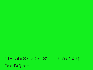CIELab 83.206,-81.003,76.143 Color is a normal green color and the nearest color is Green #00ff00. Hex code #13f01e and RGB value is rgb(19,240,30). In RGB color space, this color is composed of 7% red, 94% green, 12% blue, In CMYK color space, this color is composed of 92% cyan, 0% magenta, 88% yellow , 6% black , In HSL color space, this color has a hue angle of 123° , 88% saturation and 51% lightness.