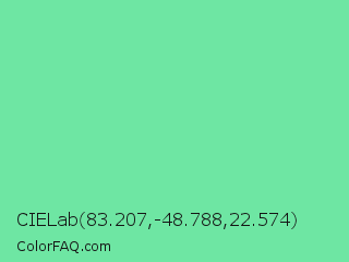 CIELab 83.207,-48.788,22.574 Color is a light green color and the nearest color is Medium Aquamarine #66ddaa. Hex code #6ee6a3 and RGB value is rgb(110,230,163). In RGB color space, this color is composed of 43% red, 90% green, 64% blue, In CMYK color space, this color is composed of 52% cyan, 0% magenta, 29% yellow , 10% black , In HSL color space, this color has a hue angle of 147° , 71% saturation and 67% lightness.