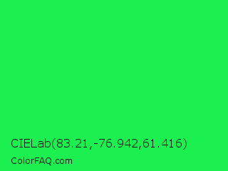 CIELab 83.21,-76.942,61.416 Color is a normal green color and the nearest color is Malachite #0bda51. Hex code #1cef50 and RGB value is rgb(28,239,80). In RGB color space, this color is composed of 11% red, 94% green, 31% blue, In CMYK color space, this color is composed of 88% cyan, 0% magenta, 67% yellow , 6% black , In HSL color space, this color has a hue angle of 135° , 87% saturation and 52% lightness.