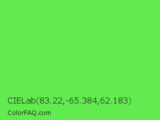 CIELab 83.22,-65.384,62.183 Color is a light green color and the nearest color is Screamin Green #66ff66. Hex code #62eb4f and RGB value is rgb(98,235,79). In RGB color space, this color is composed of 38% red, 92% green, 31% blue, In CMYK color space, this color is composed of 58% cyan, 0% magenta, 66% yellow , 8% black , In HSL color space, this color has a hue angle of 113° , 80% saturation and 62% lightness.