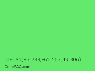 CIELab 83.233,-61.567,49.306 Color is a light green color and the nearest color is Screamin Green #66ff66. Hex code #63ea6d and RGB value is rgb(99,234,109). In RGB color space, this color is composed of 39% red, 92% green, 43% blue, In CMYK color space, this color is composed of 58% cyan, 0% magenta, 53% yellow , 8% black , In HSL color space, this color has a hue angle of 124° , 76% saturation and 65% lightness.