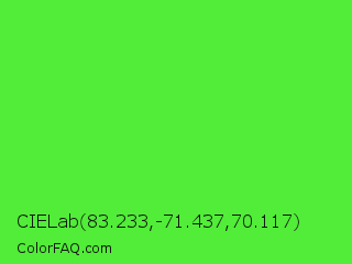 CIELab 83.233,-71.437,70.117 Color is a normal green color and the nearest color is Lime Green #32cd32. Hex code #51ed38 and RGB value is rgb(81,237,56). In RGB color space, this color is composed of 32% red, 93% green, 22% blue, In CMYK color space, this color is composed of 66% cyan, 0% magenta, 76% yellow , 7% black , In HSL color space, this color has a hue angle of 112° , 83% saturation and 57% lightness.
