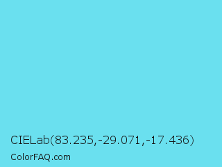 CIELab 83.235,-29.071,-17.436 Color is a light cyan color and the nearest color is Turquoise Blue #6cdae7. Hex code #6ae0ef and RGB value is rgb(106,224,239). In RGB color space, this color is composed of 42% red, 88% green, 94% blue, In CMYK color space, this color is composed of 56% cyan, 6% magenta, 0% yellow , 6% black , In HSL color space, this color has a hue angle of 187° , 81% saturation and 68% lightness.