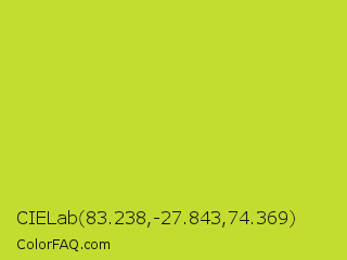 CIELab 83.238,-27.843,74.369 Color is a normal yellow color and the nearest color is Pear #d1e231. Hex code #c4db30 and RGB value is rgb(196,219,48). In RGB color space, this color is composed of 77% red, 86% green, 19% blue, In CMYK color space, this color is composed of 11% cyan, 0% magenta, 78% yellow , 14% black , In HSL color space, this color has a hue angle of 68° , 70% saturation and 52% lightness.