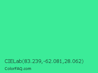 CIELab 83.239,-62.081,28.062 Color is a normal green color and the nearest color is Eucalyptus #44d7a8. Hex code #3beb98 and RGB value is rgb(59,235,152). In RGB color space, this color is composed of 23% red, 92% green, 60% blue, In CMYK color space, this color is composed of 75% cyan, 0% magenta, 35% yellow , 8% black , In HSL color space, this color has a hue angle of 152° , 81% saturation and 58% lightness.