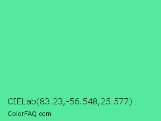 CIELab 83.23,-56.548,25.577 Color is a light green color and the nearest color is Medium Aquamarine #66ddaa. Hex code #54e99d and RGB value is rgb(84,233,157). In RGB color space, this color is composed of 33% red, 91% green, 62% blue, In CMYK color space, this color is composed of 64% cyan, 0% magenta, 33% yellow , 9% black , In HSL color space, this color has a hue angle of 149° , 77% saturation and 62% lightness.