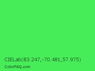 CIELab 83.247,-70.481,57.975 Color is a normal green color and the nearest color is Screamin Green #66ff66. Hex code #47ed59 and RGB value is rgb(71,237,89). In RGB color space, this color is composed of 28% red, 93% green, 35% blue, In CMYK color space, this color is composed of 70% cyan, 0% magenta, 62% yellow , 7% black , In HSL color space, this color has a hue angle of 127° , 82% saturation and 60% lightness.