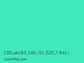 CIELab 83.249,-51.525,7.841 Color is a normal cyan color and the nearest color is Turquoise #40e0d0. Hex code #42e8bf and RGB value is rgb(66,232,191). In RGB color space, this color is composed of 26% red, 91% green, 75% blue, In CMYK color space, this color is composed of 72% cyan, 0% magenta, 18% yellow , 9% black , In HSL color space, this color has a hue angle of 165° , 78% saturation and 58% lightness.