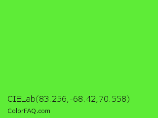 CIELab 83.256,-68.42,70.558 Color is a normal green color and the nearest color is Spring Frost #87ff2a. Hex code #5eec37 and RGB value is rgb(94,236,55). In RGB color space, this color is composed of 37% red, 93% green, 22% blue, In CMYK color space, this color is composed of 60% cyan, 0% magenta, 77% yellow , 7% black , In HSL color space, this color has a hue angle of 107° , 83% saturation and 57% lightness.