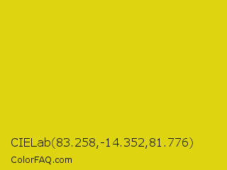 CIELab 83.258,-14.352,81.776 Color is a normal yellow color and the nearest color is Barberry #ded717. Hex code #ded40f and RGB value is rgb(222,212,15). In RGB color space, this color is composed of 87% red, 83% green, 6% blue, In CMYK color space, this color is composed of 0% cyan, 5% magenta, 93% yellow , 13% black , In HSL color space, this color has a hue angle of 57° , 87% saturation and 46% lightness.