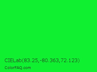 CIELab 83.25,-80.363,72.123 Color is a normal green color and the nearest color is Vivid Malachite #00cc33. Hex code #0ff030 and RGB value is rgb(15,240,48). In RGB color space, this color is composed of 6% red, 94% green, 19% blue, In CMYK color space, this color is composed of 94% cyan, 0% magenta, 80% yellow , 6% black , In HSL color space, this color has a hue angle of 129° , 88% saturation and 50% lightness.