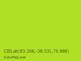 CIELab 83.268,-38.531,76.888 Color is a normal lime color and the nearest color is Inch Worm #b0e313. Hex code #b0e024 and RGB value is rgb(176,224,36). In RGB color space, this color is composed of 69% red, 88% green, 14% blue, In CMYK color space, this color is composed of 21% cyan, 0% magenta, 84% yellow , 12% black , In HSL color space, this color has a hue angle of 75° , 75% saturation and 51% lightness.