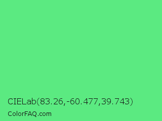 CIELab 83.26,-60.477,39.743 Color is a light green color and the nearest color is Very Light Malachite Green #64e986. Hex code #5bea81 and RGB value is rgb(91,234,129). In RGB color space, this color is composed of 36% red, 92% green, 51% blue, In CMYK color space, this color is composed of 61% cyan, 0% magenta, 45% yellow , 8% black , In HSL color space, this color has a hue angle of 136° , 77% saturation and 64% lightness.