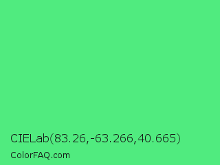 CIELab 83.26,-63.266,40.665 Color is a light green color and the nearest color is Very Light Malachite Green #64e986. Hex code #50eb7f and RGB value is rgb(80,235,127). In RGB color space, this color is composed of 31% red, 92% green, 50% blue, In CMYK color space, this color is composed of 66% cyan, 0% magenta, 46% yellow , 8% black , In HSL color space, this color has a hue angle of 138° , 79% saturation and 62% lightness.