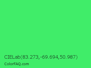 CIELab 83.273,-69.694,50.987 Color is a normal green color and the nearest color is UFO Green #3cd070. Hex code #40ed69 and RGB value is rgb(64,237,105). In RGB color space, this color is composed of 25% red, 93% green, 41% blue, In CMYK color space, this color is composed of 73% cyan, 0% magenta, 56% yellow , 7% black , In HSL color space, this color has a hue angle of 134° , 83% saturation and 59% lightness.
