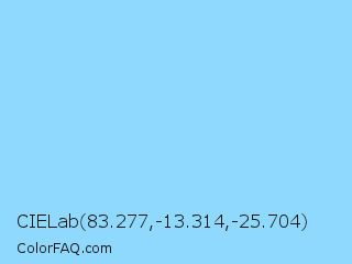 CIELab 83.277,-13.314,-25.704 Color is a light blue color and the nearest color is Pale Cyan #87d3f8. Hex code #8fd9ff and RGB value is rgb(143,217,255). In RGB color space, this color is composed of 56% red, 85% green, 100% blue, In CMYK color space, this color is composed of 44% cyan, 15% magenta, 0% yellow , 0% black , In HSL color space, this color has a hue angle of 200° , 100% saturation and 78% lightness.