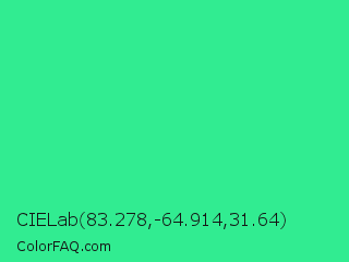 CIELab 83.278,-64.914,31.64 Color is a normal green color and the nearest color is Shamrock #33cc99. Hex code #31ec91 and RGB value is rgb(49,236,145). In RGB color space, this color is composed of 19% red, 93% green, 57% blue, In CMYK color space, this color is composed of 79% cyan, 0% magenta, 39% yellow , 7% black , In HSL color space, this color has a hue angle of 151° , 83% saturation and 56% lightness.