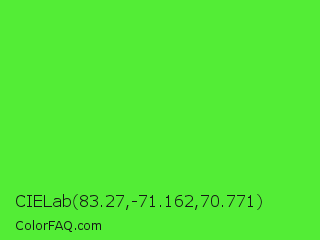 CIELab 83.27,-71.162,70.771 Color is a normal green color and the nearest color is Lime Green #32cd32. Hex code #53ed36 and RGB value is rgb(83,237,54). In RGB color space, this color is composed of 33% red, 93% green, 21% blue, In CMYK color space, this color is composed of 65% cyan, 0% magenta, 77% yellow , 7% black , In HSL color space, this color has a hue angle of 110° , 84% saturation and 57% lightness.