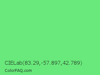 CIELab 83.29,-57.897,42.789 Color is a light green color and the nearest color is Very Light Malachite Green #64e986. Hex code #69e97b and RGB value is rgb(105,233,123). In RGB color space, this color is composed of 41% red, 91% green, 48% blue, In CMYK color space, this color is composed of 55% cyan, 0% magenta, 47% yellow , 9% black , In HSL color space, this color has a hue angle of 128° , 74% saturation and 66% lightness.
