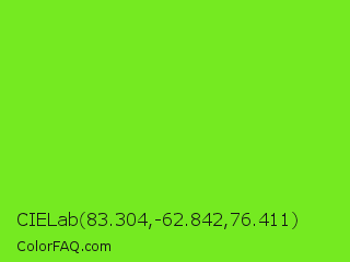 CIELab 83.304,-62.842,76.411 Color is a normal green color and the nearest color is Spring Frost #87ff2a. Hex code #75ea21 and RGB value is rgb(117,234,33). In RGB color space, this color is composed of 46% red, 92% green, 13% blue, In CMYK color space, this color is composed of 50% cyan, 0% magenta, 86% yellow , 8% black , In HSL color space, this color has a hue angle of 95° , 83% saturation and 52% lightness.