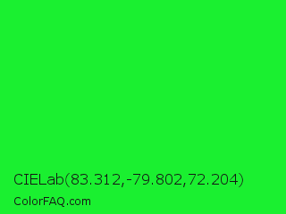 CIELab 83.312,-79.802,72.204 Color is a normal green color and the nearest color is Malachite #0bda51. Hex code #1af030 and RGB value is rgb(26,240,48). In RGB color space, this color is composed of 10% red, 94% green, 19% blue, In CMYK color space, this color is composed of 89% cyan, 0% magenta, 80% yellow , 6% black , In HSL color space, this color has a hue angle of 126° , 88% saturation and 52% lightness.