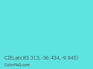 CIELab 83.313,-36.434,-9.945 Color is a light cyan color and the nearest color is Turquoise Blue #6cdae7. Hex code #5ee3e1 and RGB value is rgb(94,227,225). In RGB color space, this color is composed of 37% red, 89% green, 88% blue, In CMYK color space, this color is composed of 59% cyan, 0% magenta, 1% yellow , 11% black , In HSL color space, this color has a hue angle of 179° , 70% saturation and 63% lightness.
