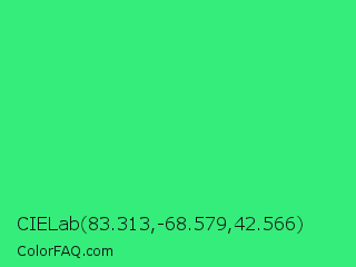 CIELab 83.313,-68.579,42.566 Color is a normal green color and the nearest color is UFO Green #3cd070. Hex code #35ed7b and RGB value is rgb(53,237,123). In RGB color space, this color is composed of 21% red, 93% green, 48% blue, In CMYK color space, this color is composed of 78% cyan, 0% magenta, 48% yellow , 7% black , In HSL color space, this color has a hue angle of 143° , 84% saturation and 57% lightness.
