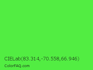 CIELab 83.314,-70.558,66.946 Color is a normal green color and the nearest color is Screamin Green #66ff66. Hex code #52ed42 and RGB value is rgb(82,237,66). In RGB color space, this color is composed of 32% red, 93% green, 26% blue, In CMYK color space, this color is composed of 65% cyan, 0% magenta, 72% yellow , 7% black , In HSL color space, this color has a hue angle of 114° , 83% saturation and 59% lightness.