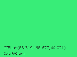 CIELab 83.319,-68.677,44.021 Color is a normal green color and the nearest color is UFO Green #3cd070. Hex code #38ed78 and RGB value is rgb(56,237,120). In RGB color space, this color is composed of 22% red, 93% green, 47% blue, In CMYK color space, this color is composed of 76% cyan, 0% magenta, 49% yellow , 7% black , In HSL color space, this color has a hue angle of 141° , 83% saturation and 57% lightness.