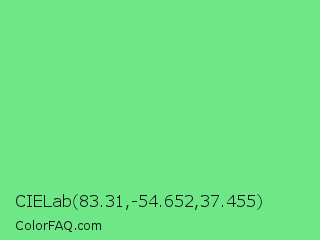 CIELab 83.31,-54.652,37.455 Color is a light green color and the nearest color is Very Light Malachite Green #64e986. Hex code #6ee886 and RGB value is rgb(110,232,134). In RGB color space, this color is composed of 43% red, 91% green, 53% blue, In CMYK color space, this color is composed of 53% cyan, 0% magenta, 42% yellow , 9% black , In HSL color space, this color has a hue angle of 132° , 73% saturation and 67% lightness.