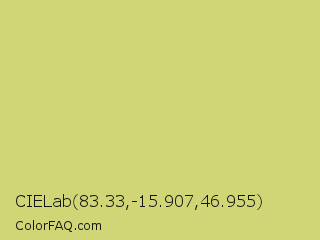 CIELab 83.33,-15.907,46.955 Color is a light yellow color and the nearest color is Yellow Green #c5e17a. Hex code #d0d675 and RGB value is rgb(208,214,117). In RGB color space, this color is composed of 82% red, 84% green, 46% blue, In CMYK color space, this color is composed of 3% cyan, 0% magenta, 45% yellow , 16% black , In HSL color space, this color has a hue angle of 64° , 54% saturation and 65% lightness.