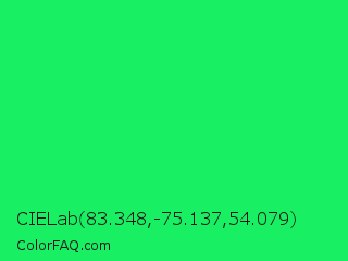 CIELab 83.348,-75.137,54.079 Color is a normal green color and the nearest color is Malachite #0bda51. Hex code #19ef62 and RGB value is rgb(25,239,98). In RGB color space, this color is composed of 10% red, 94% green, 38% blue, In CMYK color space, this color is composed of 90% cyan, 0% magenta, 59% yellow , 6% black , In HSL color space, this color has a hue angle of 140° , 87% saturation and 52% lightness.