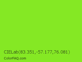 CIELab 83.351,-57.177,76.081 Color is a normal green color and the nearest color is Spring Frost #87ff2a. Hex code #85e824 and RGB value is rgb(133,232,36). In RGB color space, this color is composed of 52% red, 91% green, 14% blue, In CMYK color space, this color is composed of 43% cyan, 0% magenta, 84% yellow , 9% black , In HSL color space, this color has a hue angle of 90° , 81% saturation and 53% lightness.